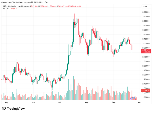 Buyers are defending $2.7, but lower lows are forming. Trading volume shows rising sell pressure. Momentum indicators suggest cautious positioning as bulls struggle. Analysts note that XRP could see a rebound if ETF approvals continue.