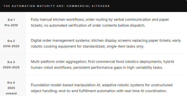 The second wave, still ongoing in most commercial kitchen environments, introduced digital coordination layers: kitchen display systems, order aggregation software, and delivery platform integrations that improved the information flow within the kitchen without addressing the physical execution of fulfillment tasks. These systems reduced certain categories of communication error and provided operators with data on fulfillment performance that they previously lacked, but they did not fundamentally alter the labor dependency of the physical workflows they coordinated. A kitchen with a sophisticated digital order management system and a kitchen without one both ultimately require humans to open bags, place containers, verify contents, and seal orders.
