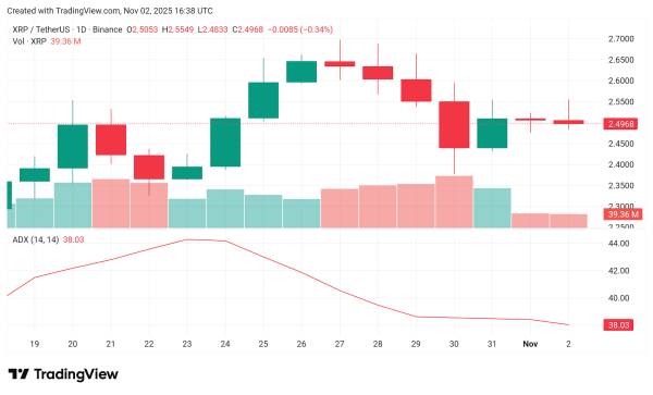 According to data from TradingView, the XRP price trades at $2.49. The ADI indicator which reads 38 shows that the altcoin has been on a downtrend in the last week. Nevertheless, it remains part of the top 5 coins. The market cap of $150 billion while its trading volume has dropped by 18% in the past day to $2.24 billion.