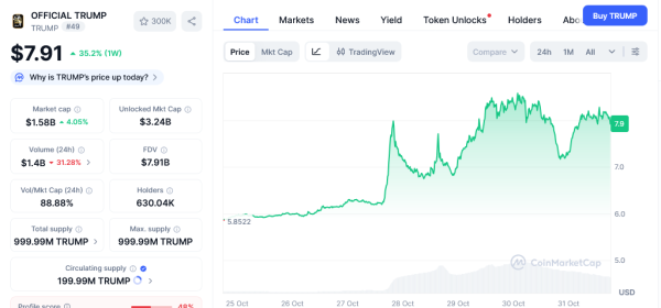 The TRUMP price stood at $7.91following a 35.2% jump in the past week. Likewise, TRUMP’s 30-day price chart shows a 5.33% jump over the past month. One factor that could boost TRUMP’s performance in the coming months is potential adoption in fundraising activities.