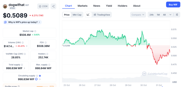 As of October 31, WIF’s value stands at $0.5089 following a 4.21% fall over the past 7 days. Its bearishness has also caused a double-digit drop on its 30-day price charts.