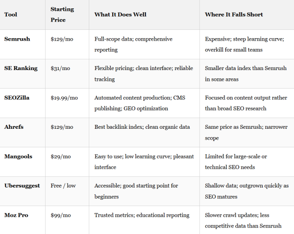 The options mentioned in the article are the best available choices as of 2026, and there are no compromises. In fact, some of these tools are better suited for smaller businesses than Semrush has ever been, simply because they were created with smaller businesses in mind from the outset.