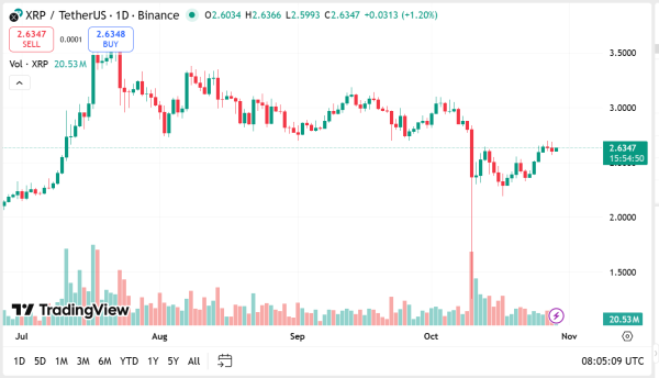 On the daily XRP/USD chart, price surged in July, drifted down in September, and printed a steep capitulation in early October, which likely swept late trades. Price has been, since mid-October, drawing higher lows, which have created a possible inverted head-and-shoulder and a neckline of around $2.63-2.70.